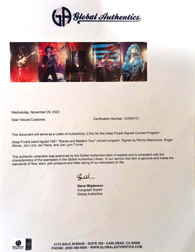 До вашої уваги представлені сертифіковані автентичні автографи учасників легендарного гурту Deep Purple, залишені на концертній програмі 1981 року «Slaves and Masters Tour» (індекс З).