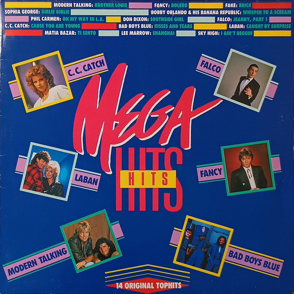 Обкладинка альбому виконана у насиченому синьому кольорі з яскравим рожево-червоним логотипом «Mega Hits» у центрі. На лицьовій стороні розміщені фотокартки ключових виконавців у кольорових рамках: C.C. Catch, Falco, Laban, Fancy, Modern Talking та Bad Boys Blue. У верхній та нижній частинах обкладинки наведені назви всіх композицій та артистів, що увійшли до цього релізу.